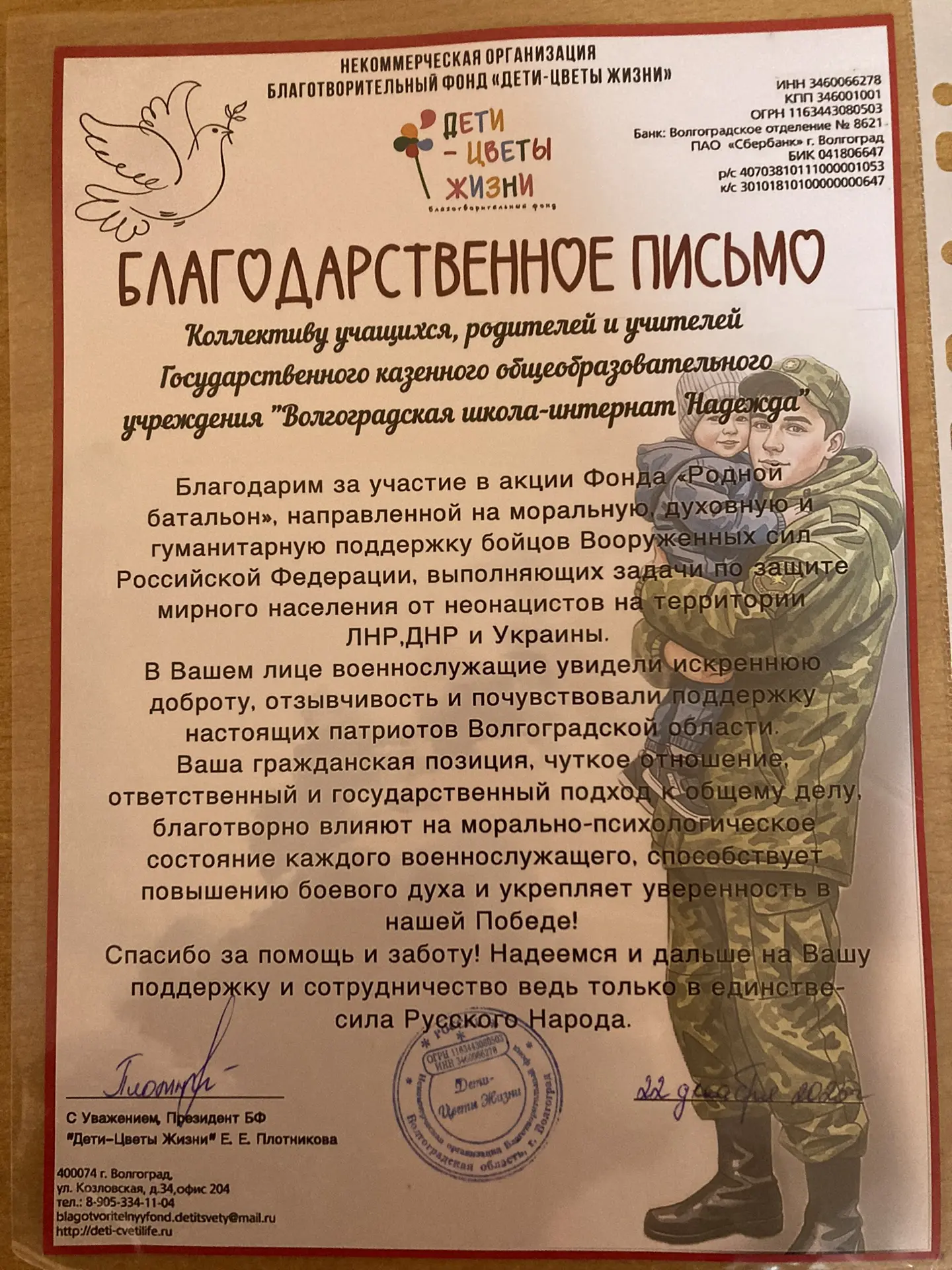 Уважаемые родители, обучающиеся, сотрудники, спасибо большое всем-всем, кто принял участие в акциях "Родной батальон", "Письмо солдату". Сегодня состоялась передача посылок и писем для наших защитников в зону СВО через благотворительный фонд "Дети цветы жизни". Руководитель фонда Плотникова Елена Евгеньевна просил всем вам передать благодарность, вручила благодарственное письмо, пообещала, что обязательно передаст от нас привет нашим дорогим военнослужащим и поздравления с наступающим Новым годом.